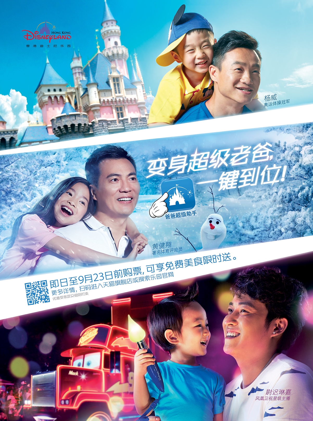 著名體育評論員黃健翔、奧運冠軍楊威、鳳凰衛視星級主持人尉遲琳嘉相繼變身「超級老爸」,帶著自己的萌娃現身香港迪士尼樂園拍攝「變身超級老爸,一鍵到位」系列宣傳片,星爸與萌寶一起夏天玩雪、撒歡,享受美食,體驗了一番「一鍵到位」的溫馨時光。