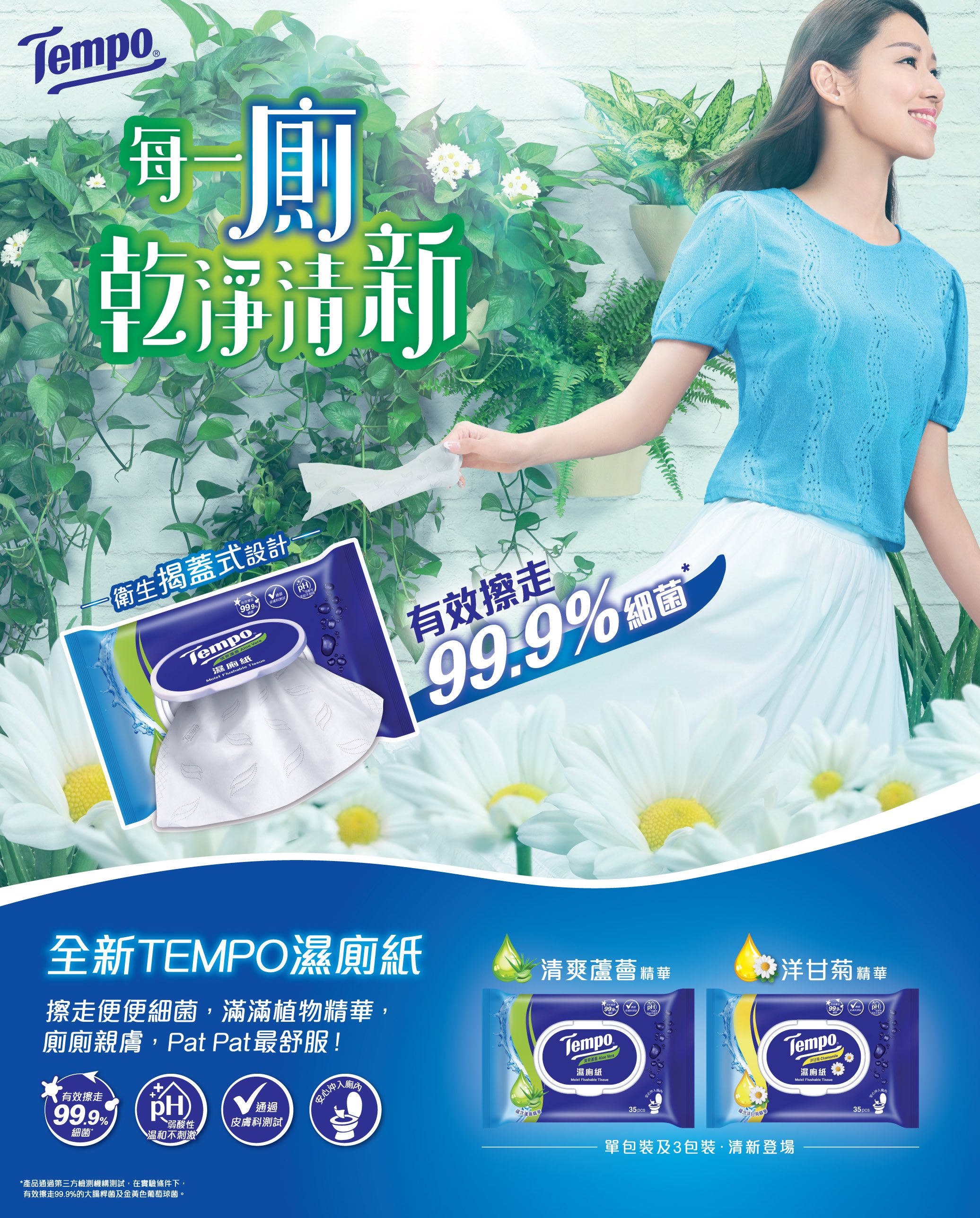 Tempo濕廁紙帶來全新體驗,揭蓋式設計鎖住水份,而且方便衛生。濕廁紙唔單止可以擦走Pat Pat 99.9%細菌,更加入咗植物精華,溫和pH值鍚住敏感部位每吋肌膚!濕廁紙通過歐美可沖散測試,可生物分解,一沖即走不留痕跡,貼心又放心!
